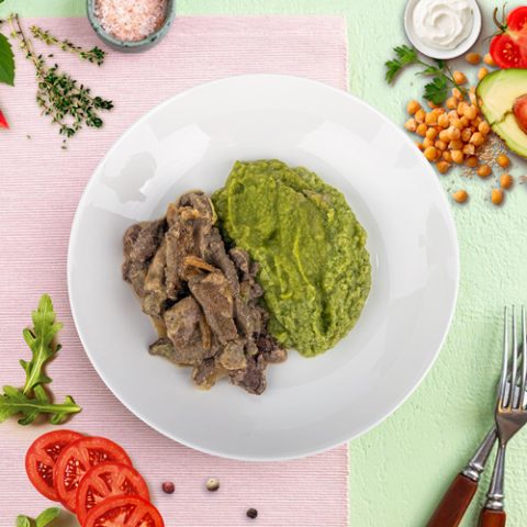Состав: Печень говяжья, лук, масло растительное, сливки, крахмал, соль, перец, вода, брокколи, масло сливочное.